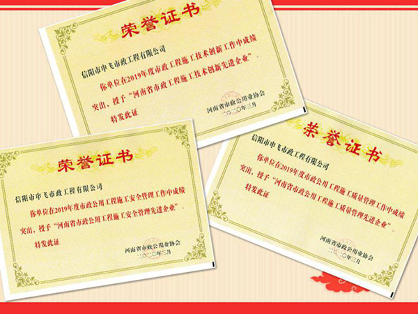 除省金杯獎之外,公司承建的中心城區(qū)浉河兩岸排污口過渡性污水污水二期工程二標(biāo)段被評為“河南省市政優(yōu)良工程”,平橋區(qū)平東路(浉河北路-平橋大道)新建工程(二標(biāo)段)被評為2019年度“市政工程省級安全文明工地”。